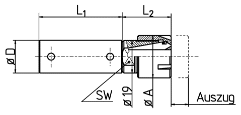 | Nr. | Bezeichnung | D (mm) | A (mm) | L 1 (mm) | L 2 (mm) | SW (mm) | Bereich | Auszug (mm) | Zange | Mutter |